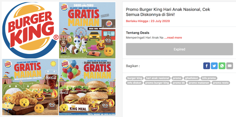 Sebagai contoh, Burger King Indonesia memberikan promosi mainan gratis sebagai bagian dari perayaan Hari Anak Nasional Juli lalu, walau Indonesia telah meratifikasi Konvensi PBB tentang Hak Anak sejak 1990 yang menjamin hak kesehatan pada anak.