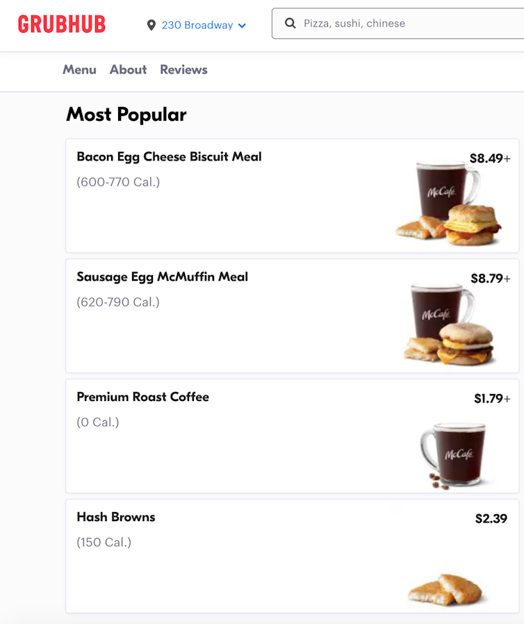 Contoh informasi jumlah kalori di aplikasi pesan antar Grubhub di Amerika Serikat.