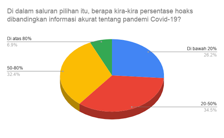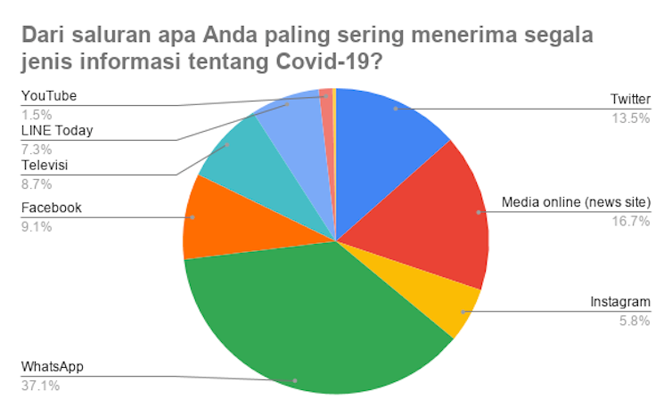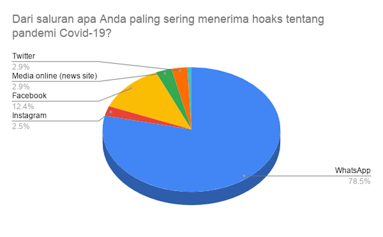 Survei itu menunjukkan bahwa WhatsApp adalah saluran utama warga dalam menerima segala jenis informasi tentang pandemi, baik benar atau hoaks. Sekitar separuh responden juga mengatakan bahwa informasi yang mereka terima sebagian besar hoaks dan merasa pemerintah belum berbuat banyak dalam memberikan informasi.