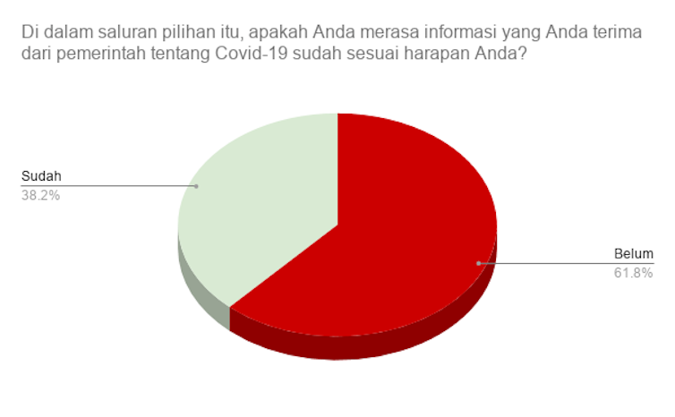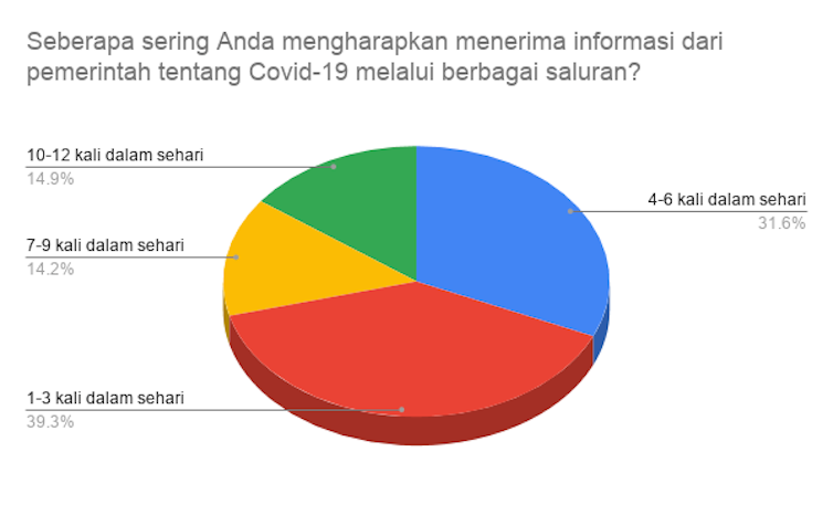 Sebagian besar responden (lebih dari 60%) merasa informasi dari pemerintah selama ini belum memenuhi harapan mereka. Lebih dari 60% responden juga ingin menerima pasokan informasi dari pemerintah antara 4-12 kali sehari.